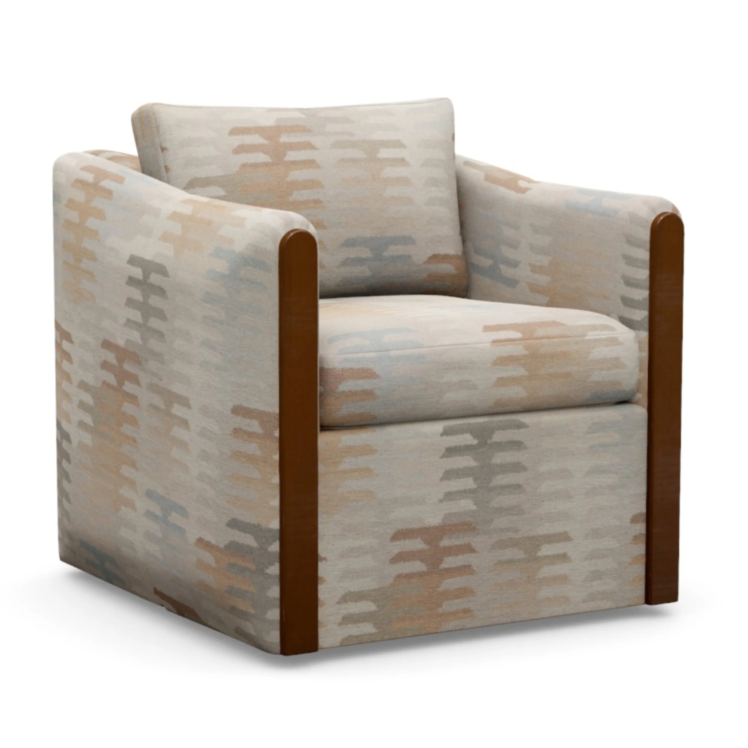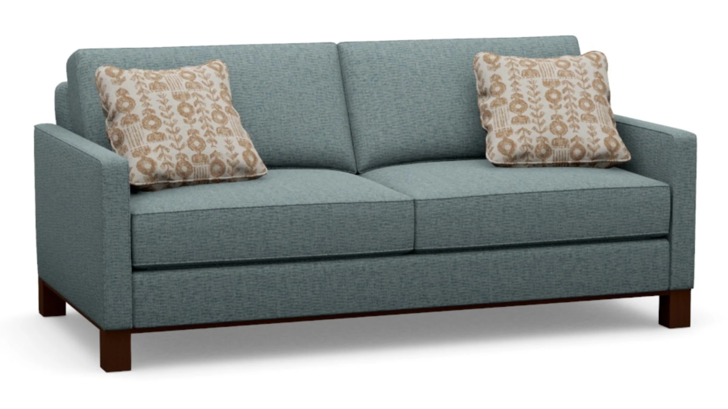 76" x 38" x 36.5" h | SD 23" | SH 20" | Cover: Ribbed Chenille in Slate Blue | Pillows: Woven Arrows in Light Blue and Caramel | Finish: Warm Brown